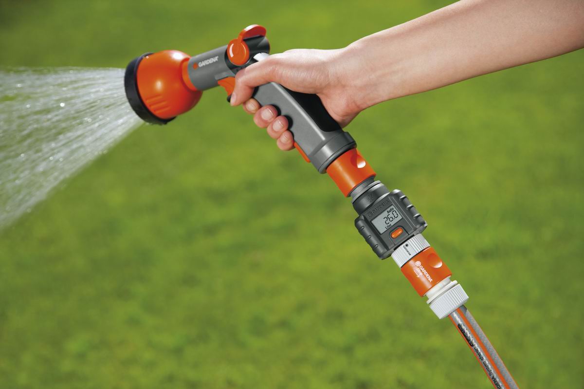 Moderný GARDENA prietokomer / vodomer umožňuje cielené zavlažovanie, ktoré je merateľné a úsporné. Vďaka meraniu množstva pretečenej vody je ľahké dávkovať vodu podľa požiadaviek: toľko, koľko je treba, ale tak málo, ako je to len možné. Variabilné použitie s Original GARDENA systémom: pripojte prietokomer na vodovodný kohútik, na zalievaciu sprchu alebo postrekovač, na zavlažovač alebo záhradné čerpadlo. Bez ohľadu na miesto použitia sa spotreba vody viditeľne zobrazí na displeji. GARDENA prietokomer ponúka štyri funkcie pre meranie množstva použitej vody. Jednoduchým stlačením jediného gombíka prepínate z jednej funkcie na druhú.